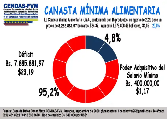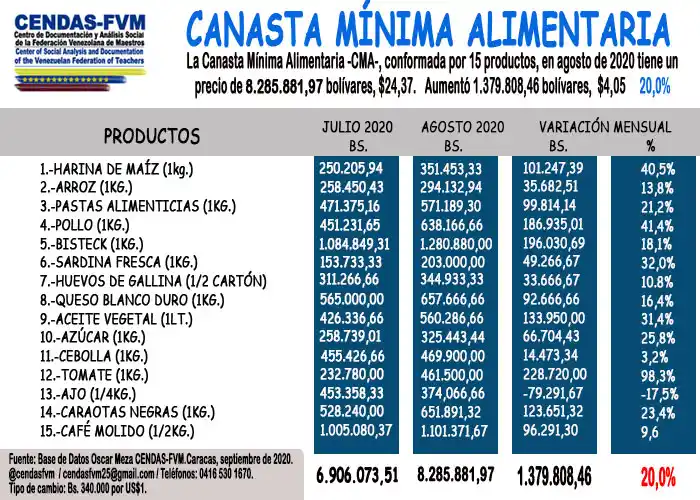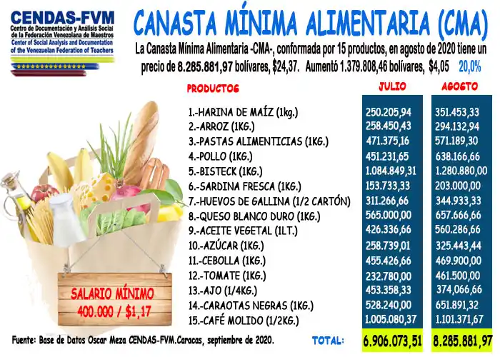 El Centro de Documentación y Análisis Social de la Federación Venezolana de Maestros, informó que la Canasta Mínima Alimentaria (CMA) de agosto se ubicó en 8.285.881,97 bolívares. Esto equivale a 24.37 dólares.