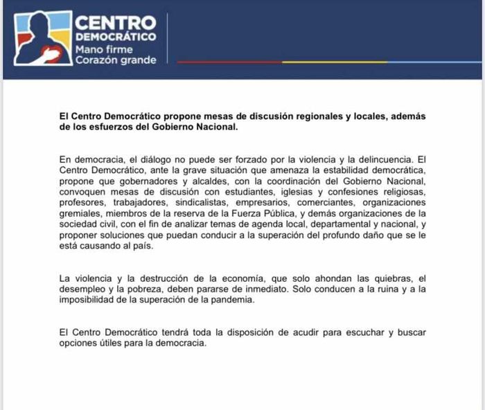 El Centro Democrático insistió que, en democracia, «el diálogo no puede ser forzado por la violencia y la delincuencia». Y reconoció la grave situación que está ocurriendo en el país “que amenaza la estabilidad democrática”.