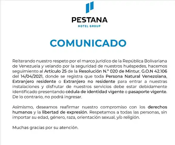 Poco después, el hotel Pestana publicó un comunicado en el que aseguran que respetan el marco jurídico venezolano y citan el artículo 25 del Ministerio de Turismo; en el cual se establece que se registra que «toda persona natural venezolana, extranjero residente o extranjero no residente para entrar a nuestras instalaciones y disfrutar de nuestros servicios debe estar abiertamente identificado presentando cédula de identidad vigente o pasaporte vigente. De lo contrario, no podrá ingresar”.