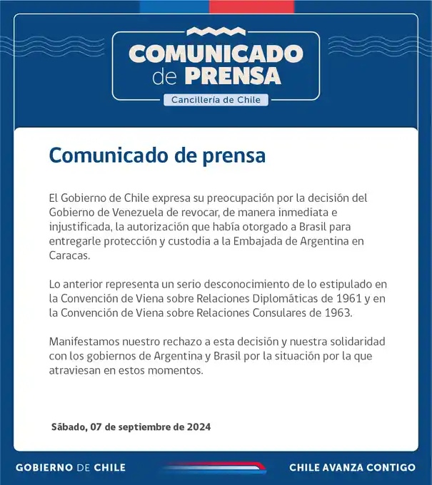 Dos de ellos son los gobiernos de Chile y Uruguay que, a través de sendos comunicados, manifestaron su preocupación por la decisión, pues consideran que se trata de «un serio desconocimiento de lo estipulado en la Convención de Viena».