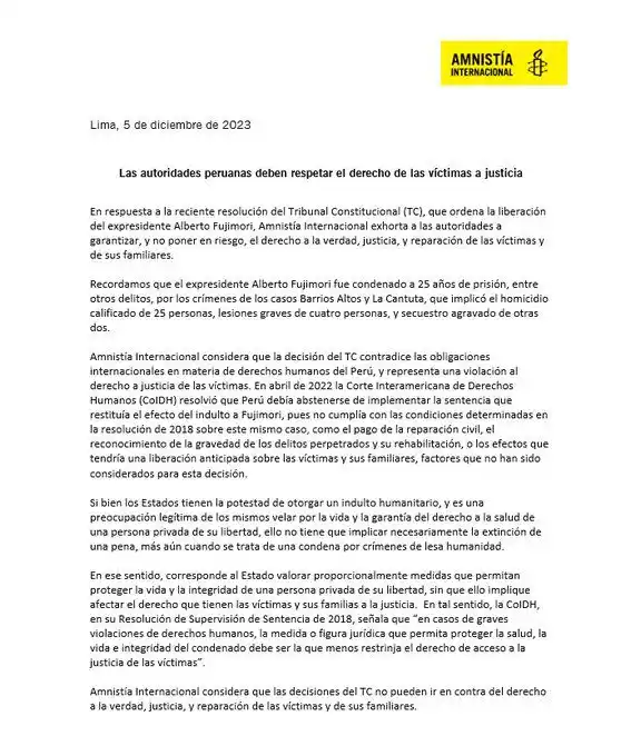 ONG como Amnistía Internacional, protestaron por la decisión del TC y ratifican las razones de la Corte IDH para exigir que Fujimori siga preso.