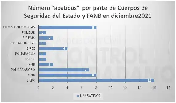 En diciembre de 2021, la ONG Control Ciudadano contabilizó 51 “abatidos” en manos de órganos de seguridad del Estado y la Fuerza Armada Nacional (FAN). Se trata de operaciones que se desarrollaron en 11 entidades federales del país.