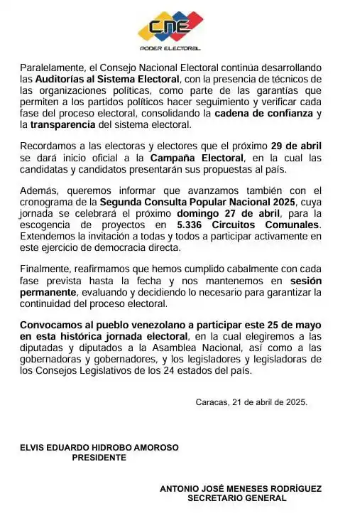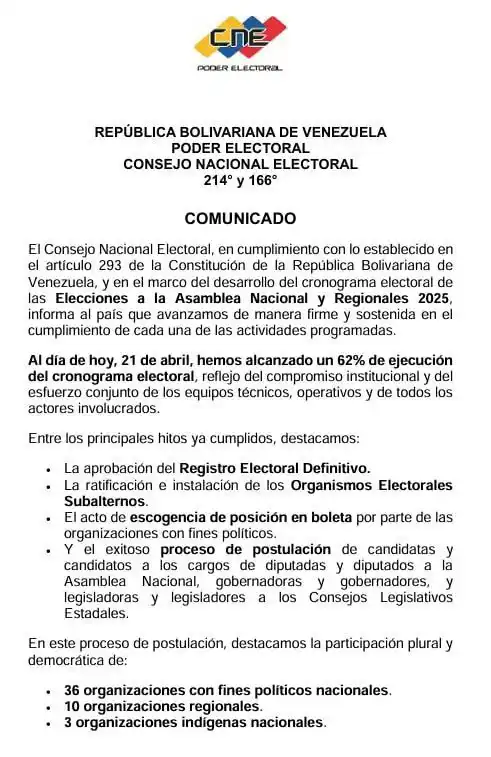 El Consejo Nacional Electoral (CNE), anunció que el cronograma para las Elecciones a la Asamblea Nacional (AN) y Regionales 2025 se ha cumplido en un 62% y recibieron 36. 986 postulaciones correspondientes a 6.687 candidatos y candidatas.