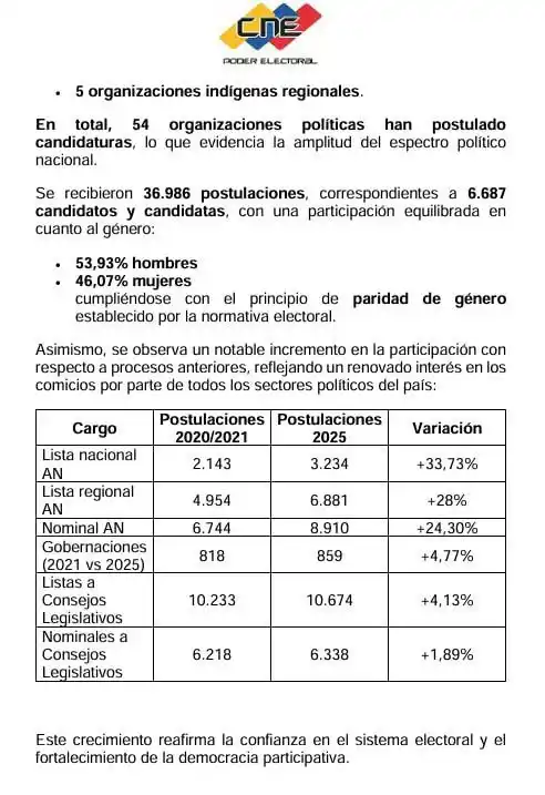 El CNE reveló que del total de postulado, 53,93% son hombres y 46,07% mujeres, cumpliéndose con el principio de paridad de género establecido por la normativa electoral.