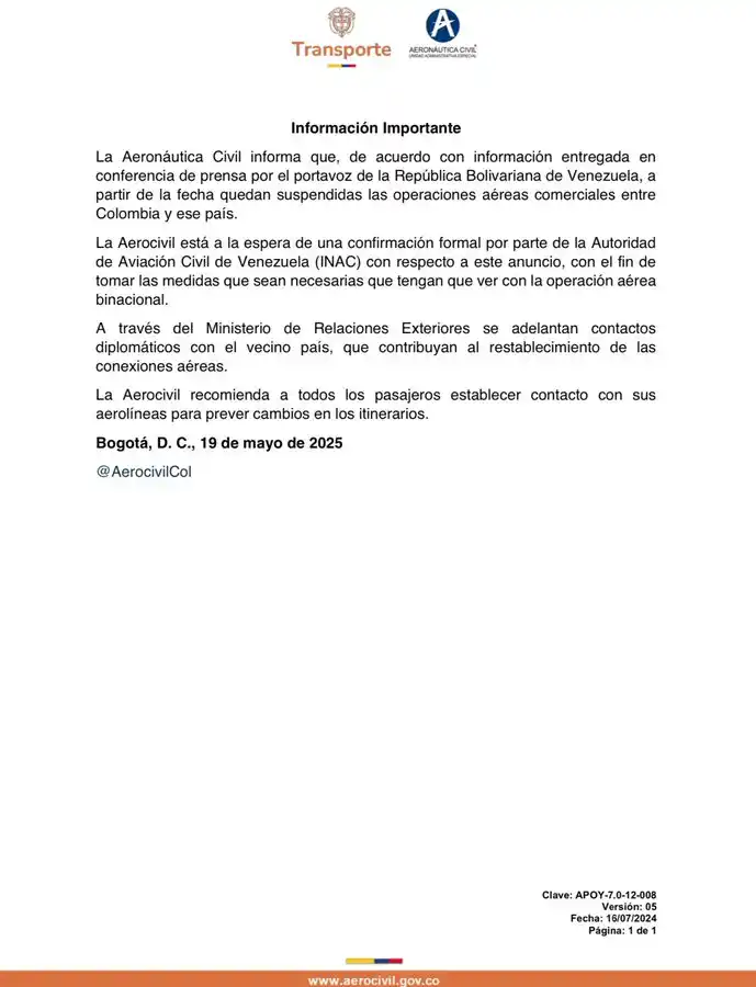 «A partir de la fecha quedan suspendidas las operaciones aéreas comerciales entre Colombia y ese país», dice el escrito.