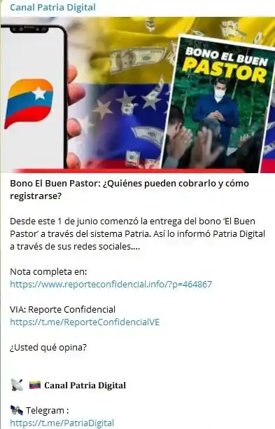 Desde el 1 de junio comenzó la entrega del bono ‘El Buen Pastor’ a través del sistema Patria. El mismo va dirigida a la comunidad cristiana de todo el territorio nacional.