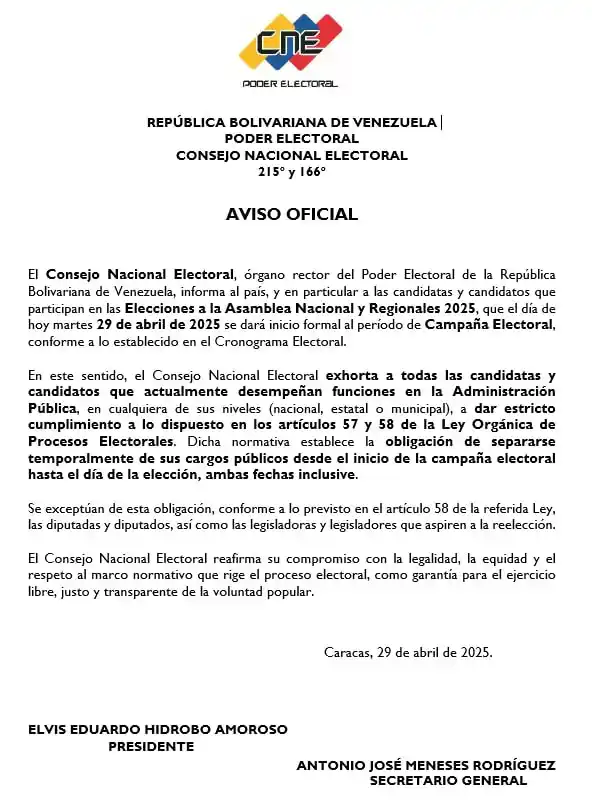 Asimismo, el CNE exhortó a todas los candidatos que actualmente desempeñan funciones en la Administración Pública, en cualquiera de sus niveles (nacional, estatal o municipal), a dar estricto cumplimiento a lo dispuesto en los artículos 57 y 58 de la Ley Orgánica de Procesos Electorales, de cara a las elecciones del 25 de mayo.