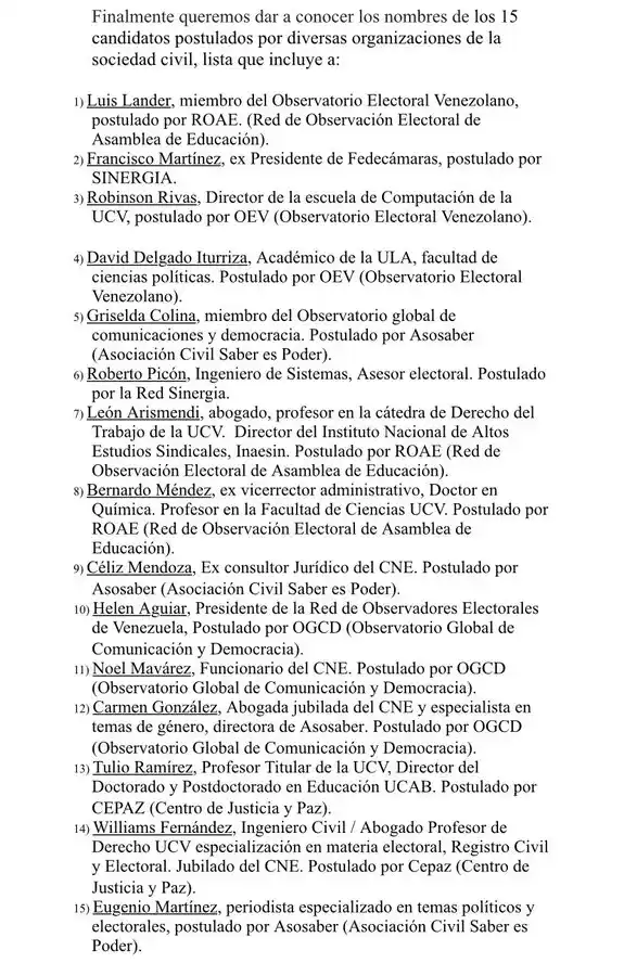 Precisó que la mayoría de los aspirantes superan incluso los requisitos para ocupar un cargo dentro del Poder Electoral. Entre los candidatos por la sociedad civil destaca Eugenio Martínez, periodista experto en materia electoral.