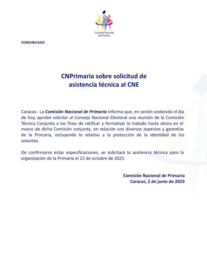 La Comisión Nacional de Primarias decidió aceptar la asistencia técnica del Consejo Nacional Electoral (CNE) para realizar la consulta prevista para el 22 de octubre.