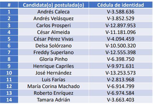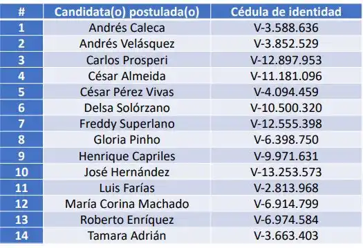 En la tarde de este lunes, la Comisión Nacional de Primaria, publicó la lista de los candidatos admitidos para medirse en la primaria opositora prevista a realizarse el 22 de octubre para definir a un candidato único que se enfrente al chavismo en las presidenciales de 2024.
