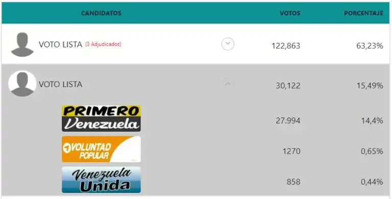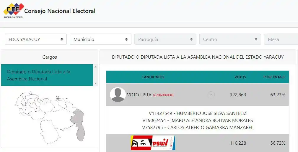 «Los seis cargos en disputa en Yaracuy fueron obtenidos por la Alianza PSUV-GPP, tanto los tres circuitos, como los tres puestos de la lista. La alianza Venezuela Unida (liderada por Luis Parra) fue el más cercano competidor, pero la cantidad de votos que obtuvo no fue suficiente», publicó Yaracuy al Día en Twitter.