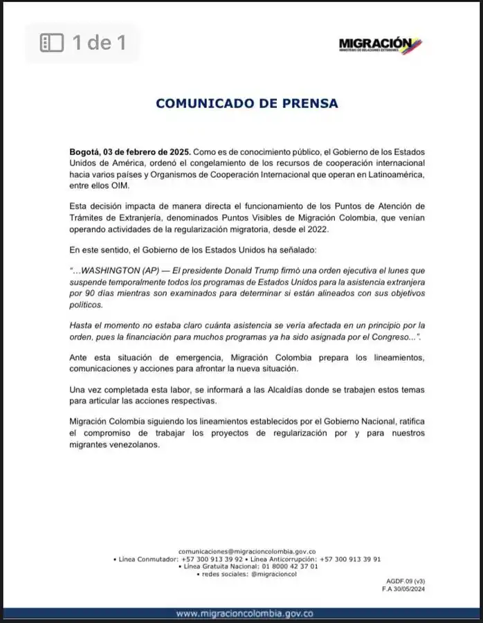 Migración Colombia publicó un comunicado en el cual alerta que, debido a los recortes para la ayuda internacional ordenados por el presidente de EE.UU., Donald Trump, se ha visto afectada su labor en relación con la regularización de extranjeros, lo cual a su vez impacta en el proceso que tiene que ver con los venezolanos.
