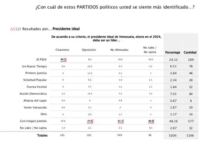 Vale destacar que, según el estudio, 48% de los consultados no está alineado con ningún partido, al momento de responder la pregunta relacionado con que a cuál partido tolda debería pertenecer el líder a elegir en las presidenciales del 2024.