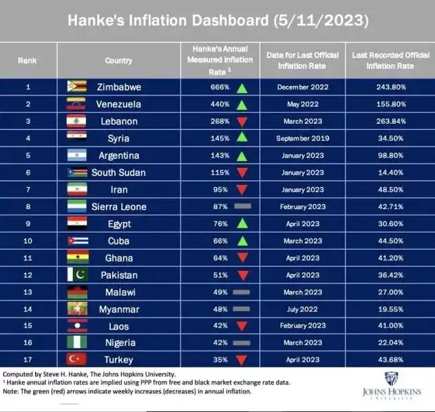 «Venezuela ocupa el segundo lugar en el resumen de inflación de Hanke de esta semana. El 11 de mayo, medí la inflación de Venezuela en 440% anual», detalló Hank en su cuenta en la red social Twitter.