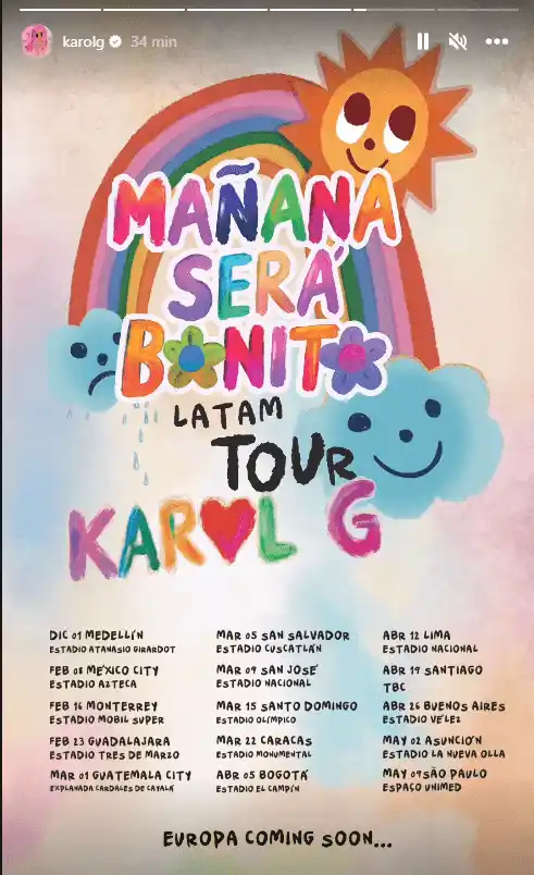 Luego de anunciar que haría tour por Latinoamérica, Karol G publicó el calendario en que se destaca que llegará a Caracas el 22 de marzo al estadio Monumental.