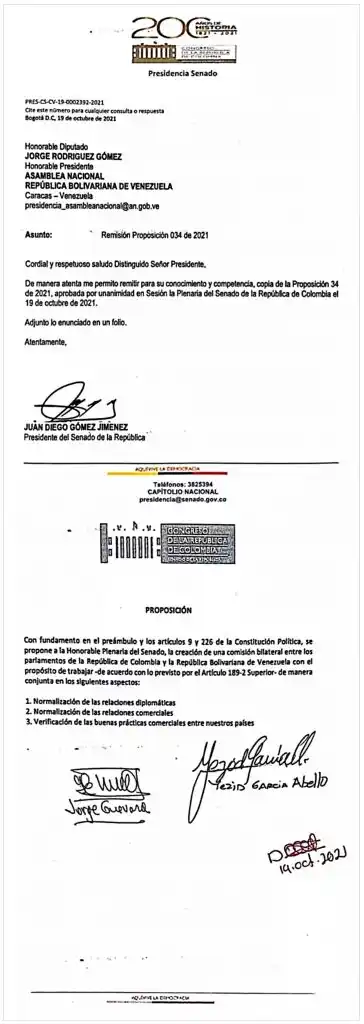 El escrito surge a propósito del anuncio del presidente del Senado del vecino país, Juan Diego Gómez Jiménez, acerca de la regularización de las relaciones entre ambos países. En el comunicado del Senado del vecino país, se destaca que esa medida de petición de restablecimiento de relaciones entre ambos países, se tomó «por unanimidad».
