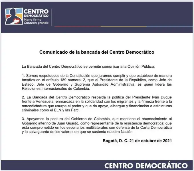 A través de un comunicado, la tolda aclara que la «bancada es respetuosa de la Constitución, que establece en el artículo 189, que el Presidente de la República como Jefe de Estado, Jefe de Gobierno y Suprema Autoridad Administrativa, es quien lidera las Relaciones Internacionales de Colombia».