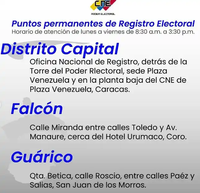 La Comisión de Registro Civil y Electoral del Consejo Nacional Electoral (CNE) publicó este sábado los puntos permanentes para la inscripción y/o actualización de datos en el Registro Electoral (RE).