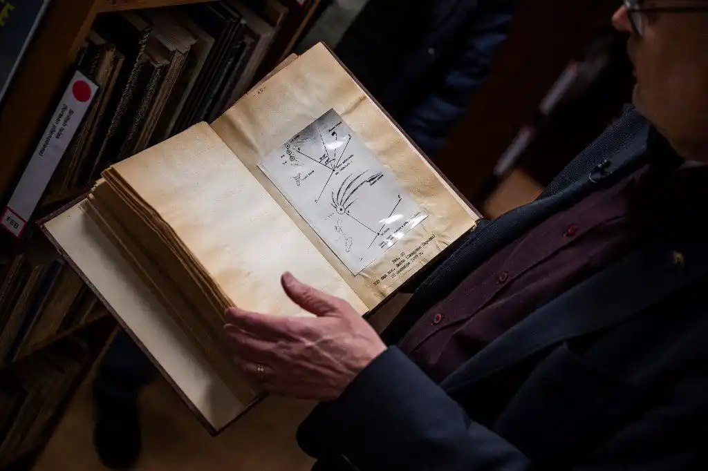 En el local dedicado a estos fenómenos aeroespaciales inexplicables, Svahn hojea las páginas amarillas de un libro de portada roja.