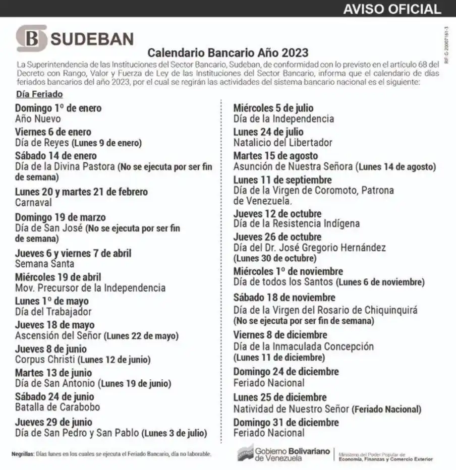 La Superintendencia de Bancos (Sudeban) presentó en sus cuentas de redes sociales el calendario bancario 2023. Indicó que dicho cronograma se elaboró de acuerdo con lo dispuesto en el artículo 68 del Decreto con Rango, Valor y Fuerza de Ley de las Instituciones del Sector Bancario.