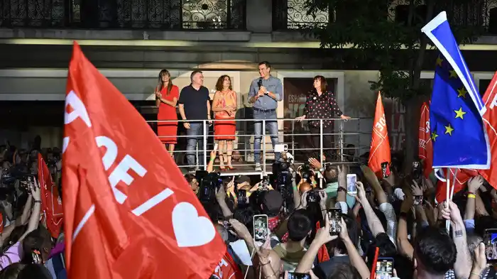 El PP y Vox, que conforman un «bloque involucionista (…) han salido derrotados», lanzó Sánchez en un estrado frente a la sede del PSOE en Madrid. «Somos muchos más los que queremos que España avance y así seguirá», añadió.