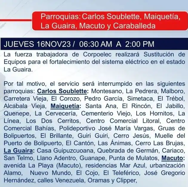 Corpoelec anunció en un comunicado la suspensión del suministro eléctrico en varios sectores de las parroquias Carlos Soublette, Maiquetía, La Guaira, Macuto y Caraballeda. Prácticamente desde Catia La Mar hasta Tanaguarena.