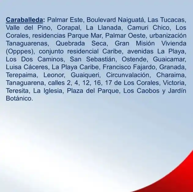 Mientras que el «apagón» incluye a la parroquia Caraballeda en Palmar Este, Boulevard Naiguatá, Las Tucacas, Valle del Pino, Corapal, La Llanada, Camurí Chico, Los Corales, Residencias Parque Mar, Palmar Oeste, Urbanización Tanaguarena, Quebrada Seca, Gran Misión Vivienda, Conjunto Residencial Caribe, Avenida La Playa, Los Dos Caminos, San Sebastián, Ostende, Guaicamar, Luisa Cáceres, La Playa Caribe, Francisco Fajardo, Granada, Terepaima, Leonor, Guaiquerí, Circunvalación Charaima, Tanaguarena, calles 2, 4, 12, 16 y 17 de Los Corales, Victoria, Teresita, La Iglesia, Plaza del Parque, Los Caobos y Jardín Botánico.