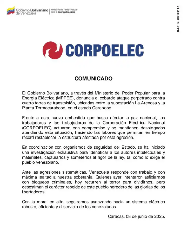 A través de un comunicado, el ministerio para la Energía Eléctrica (MPPEE) informó que frente «a esta nueva embestida que busca afectar la paz nacional, los trabajadores y las trabajadoras de la Corporación Eléctrica Nacional (Corpoelec) actuaron con compromiso y se mantienen desplegados al atender esta situación».