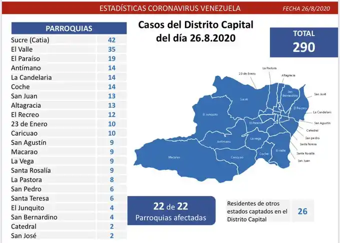 Las parroquias de Caracas con mayor número de contagiados la encabeza Sucre con 42, El Valle con 35 y El Paraíso con 19.