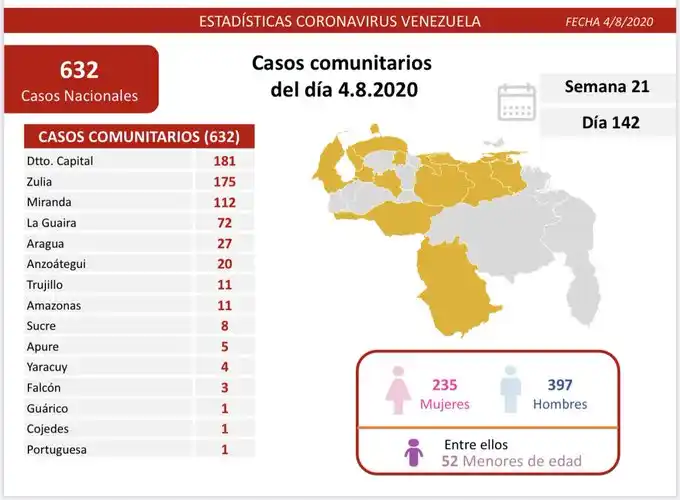 La funcionaria chavista destacó que se detectaron 632 nuevos casos de transmisión «comunitaria» y 52 casos «importados». Mientras que la entidad que más casos registra es el Distrito Capital, con 181 infectados.