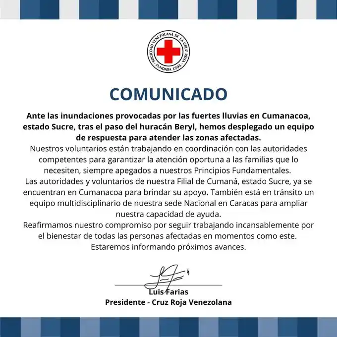 A través de un comunicado, la Cruz Roja Venezolana anunció el despliegue de sus equipos de respuesta en Cumanacoa, estado Sucre, para atender a las comunidades afectadas por el desbordamiento del río Manzanares.