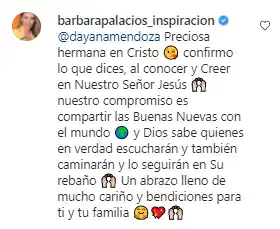 Entre otros, su paisana y colega Miss Universo, Bárbara Palacios, fue una de quienes le expresó apoyo por la publicación. Miss Venezuela 1986 destacó, entre otras cosas, que «al conocer y creer en Nuestro Señor Jesús nuestro compromiso es compartir las buenas nuevas con el mundo».