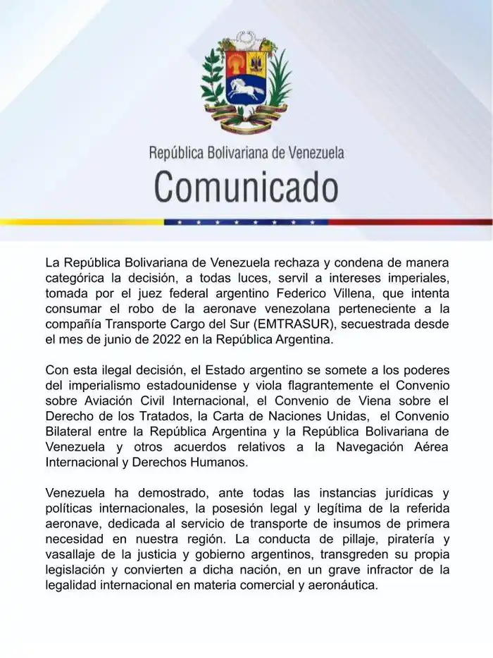 Con ello se «intenta consumar el robo de la aeronave venezolana perteneciente a la compañía Transporte Cargo del Sur (EMTRASUR), secuestrada desde el mes de junio de 2022 en la República Argentina», se expresa en un comunicado oficial.