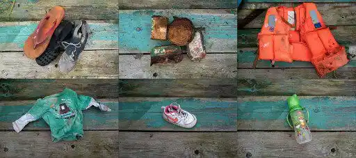 Prendas de ropa petrificadas por la sal, botellas de agua vacías, bidones llenos de arena y cámaras de aire usados como chalecos salvavidas, abandonados antes del desembarco, evocan imágenes de migrantes hacinados en embarcaciones precarias azotadas por el mar.