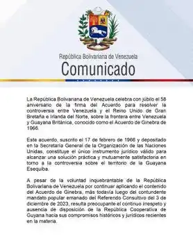 En conmemoración del 58° aniversario del Acuerdo de Ginebra, la vicepresidenta, Delcy Rodríguez, a través de un comunicado, denunció y rechazó “las declaraciones hostiles, militaristas y arrogantes” por parte de Guyana.