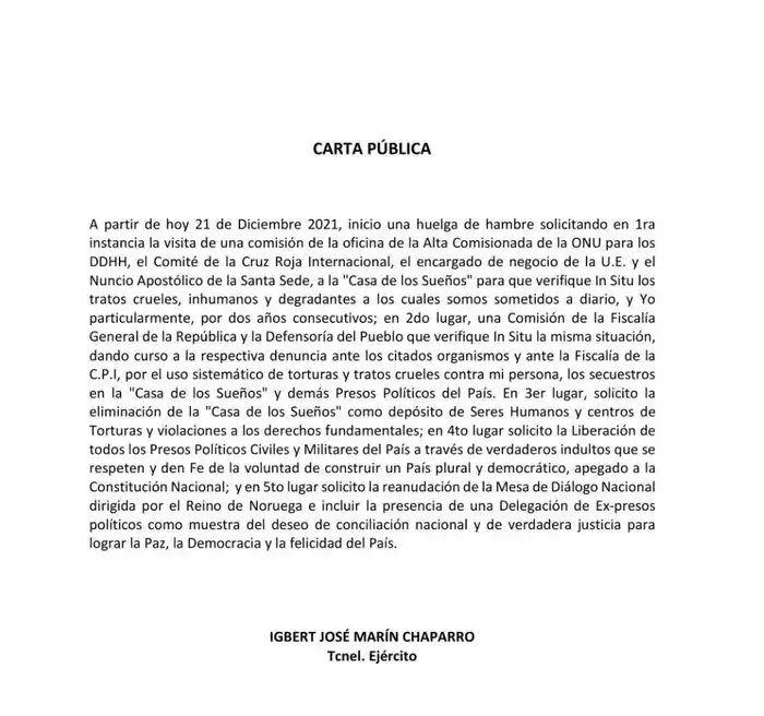 A través de una carta difundida por redes sociales, Igbert José Marín Chaparro, pidió la visita de varios organismos internacionales para que verifiquen las condiciones en que encuentran los militares presos