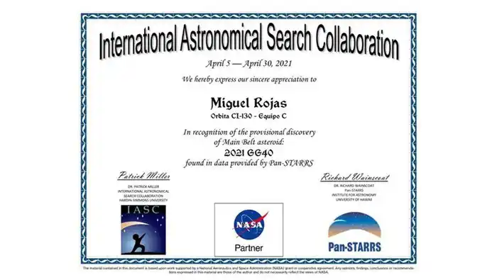 Con apenas 13 años de edad, el niño venezolano Miguel Rojas logra una certificación de la Administración Nacional de Aeronáutica y el Espacio (NASA, por sus siglas en inglés) por descubrir un asteroide entre Marte y Júpiter.