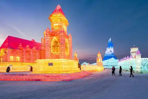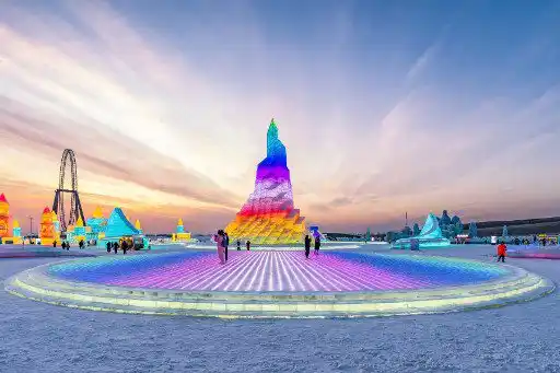 Al menos 10.000 trabajadores utilizaron 230.000 metros cúbicos de hielo y nieve para construir el parque temático para construir más de 60 grupos de paisajes, incluidas más de 100 obras