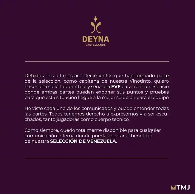 «Debido a los últimos acontecimientos que han formado parte de la selección, como capitana de nuestra Vinotinto, quiero hacer una solicitud puntual y seria a la FVF para abrir un espacio donde ambas partes puedan exponer sus puntos y pruebas para que esta situación llegue a la mejor solución para el equipo», expresó en el escrito.