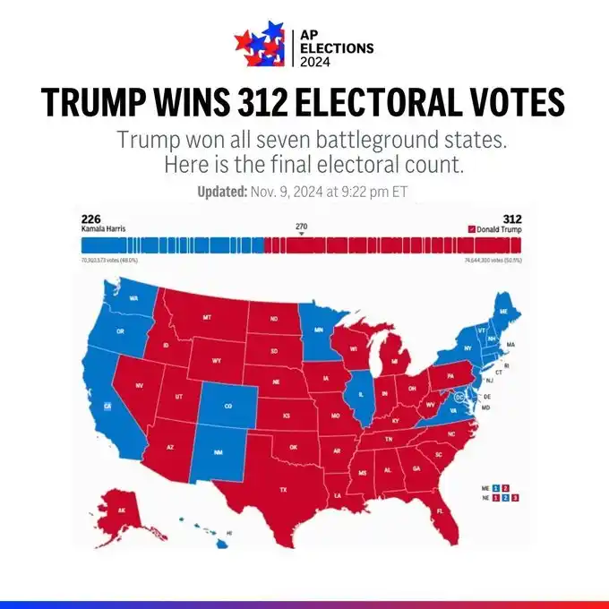 DONALD TRUMP suma 312 electores y KAMALA HARRIS se queda en 226 (+Total de votos)