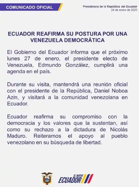 En su comunicado, el gobierno ecuatoriano expresó que «reafirma su compromiso con la democracia y los valores que la sustentan, así como su rechazo a la dictadura de Nicolás Maduro».