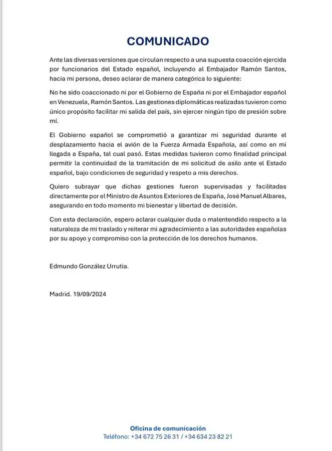 Ante las diversas versiones que circulan respecto a una supuesta coacción ejercida por funcionarios del Estado español, incluyendo al Embajador Ramón Santos, hacia mi persona, deseo aclarar de manera categórica lo siguiente: No he sido coaccionado ni por el Gobierno de España ni por el Embajador español en Venezuela, Ramón Santos. Las gestiones diplomáticas realizadas tuvieron como único propósito facilitar mi salida del país, sin ejercer ningún tipo de presión sobre mí.