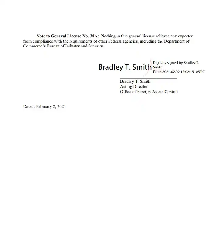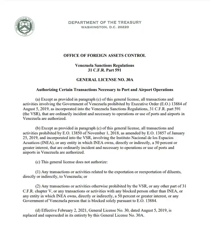 Según el texto firmado por Bradley T. Smith, director en funciones de la Oficina de Control de Activos Extranjeros (OFAC, por sus siglas en inglés), se permiten transacciones y actividades que habían sido prohibidas en la Orden Ejecutiva 13850 de noviembre de 2018 —modificada en enero de 2019—.