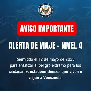 Se trata del «Alerta de Viaje – Nivel 4, reemitido el 12 de mayo de 2025, para enfatizar el peligro extremo para los ciudadanos estadounidenses que viven o viajan a Venezuela» publicó la embajada de EE.UU. en sus redes sociales.