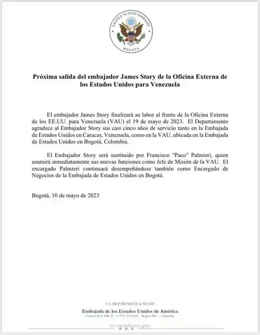 «Story finalizará su labor al frente de la Oficina Externa de los EEUU para Venezuela (VAU) el 19 de mayo de 2023 (…). Será sustituido por Francisco ‘Paco’ Palmieri, quien asumirá inmediatamente sus nuevas funciones como Jefe de Misión de la VAU», según un comunicado reseñado por AFP.