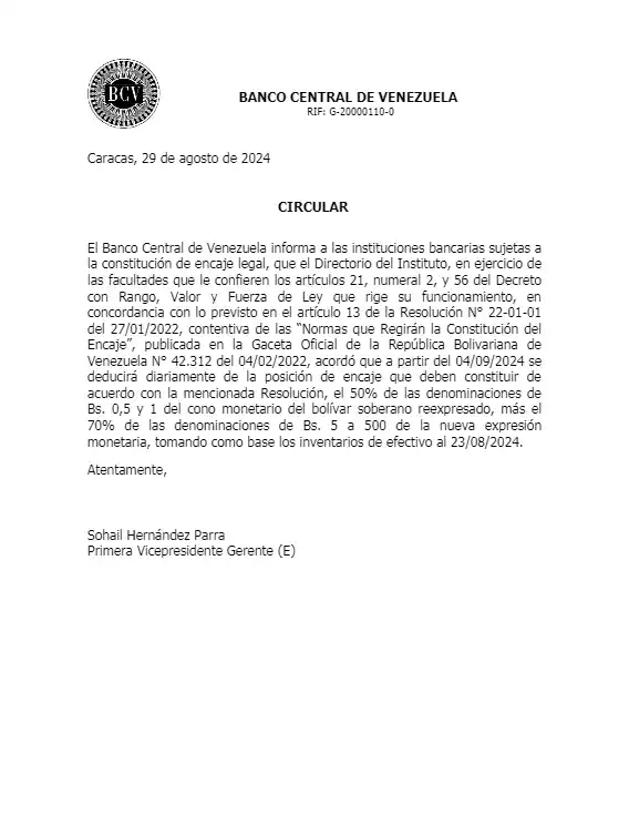«Se deducirá diariamente de la posición de encaje que deben constituir, de acuerdo con la mencionada Resolución, 50% de las denominaciones de Bs. 0,5 y 1 del cono monetario del bolívar soberano reexpresado, más 70% de las denominaciones de Bs. 5 a 500 de la nueva expresión monetaria, tomando como base los inventarios de efectivo al 23/08/2024», dice la resolución.