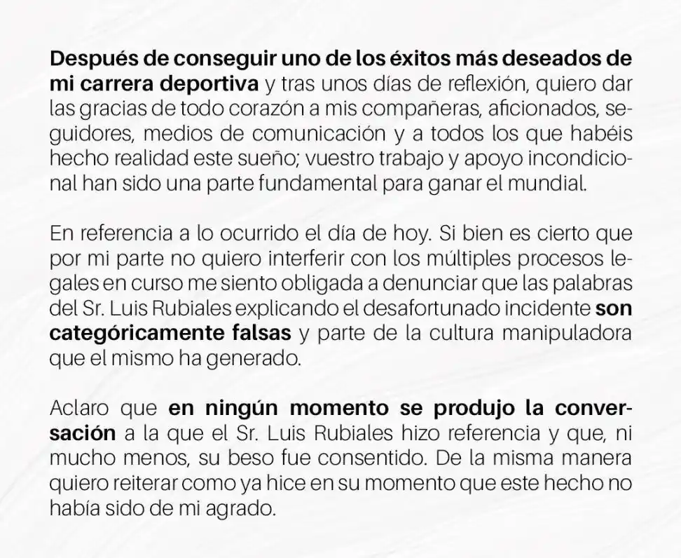 A la vista de las manifestaciones realizadas por el presidente de la Real Federación Española de Fútbol, Jennifer Hermoso quiere desmentir rotundamente que consintiera el beso que le propinó don Luis Manuel Rubiales Béjar en la Final de la Copa del Mundo. «Quiero aclarar que, tal y como se vio en las imágenes, en ningún momento consentí el beso que me propinó y, por supuesto, en ningún caso busqué alzar al presidente. No tolero que se ponga en duda mi palabra y mucho menos que se inventen palabras que no he dicho«, señala Hermoso.
