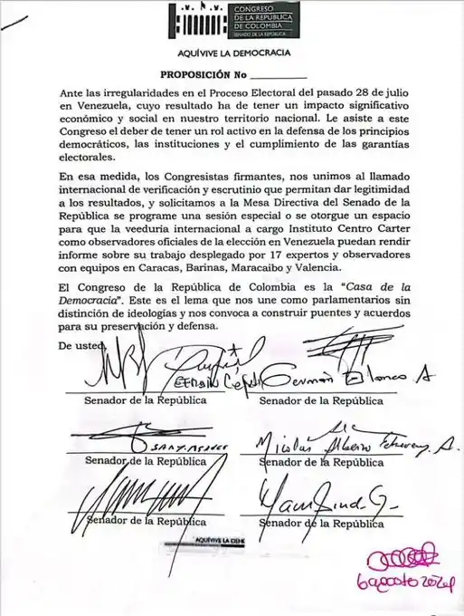La plenaria del Senado de Colombia aprobó la propuesta del Partido Conservador para que se convoque una sesión informal en la que el Centro Carter pueda presentar su informe sobre las elecciones en Venezuela, en donde el Consejo Nacional Electoral le otorgó la victoria al presidente Nicolás Maduro.