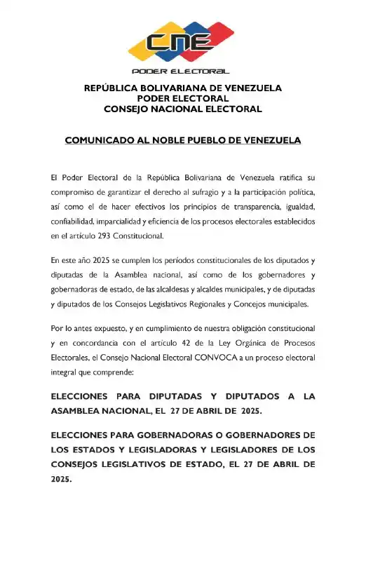 ELECCIONES de la AN, gobernaciones y consejos legislativos ya tienen fecha: el CNE convocó para el 27 de abril