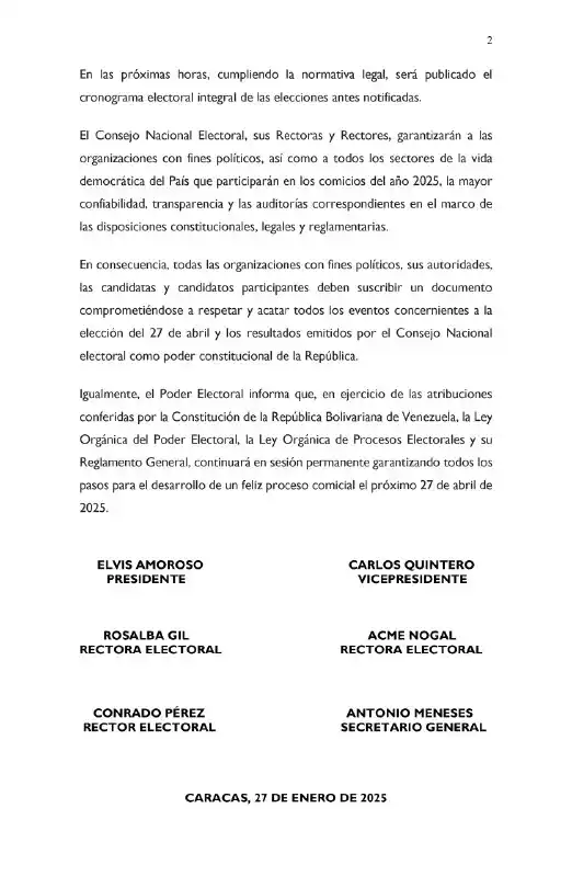«El CNE convoca a un proceso integral que comprende elecciones para la Asamblea Nacional de fecha día 27 de abril y Gobernadores y Consejo Legislativo»para el mismo 27 de abril», dijo el rector, al leer un comunicado.